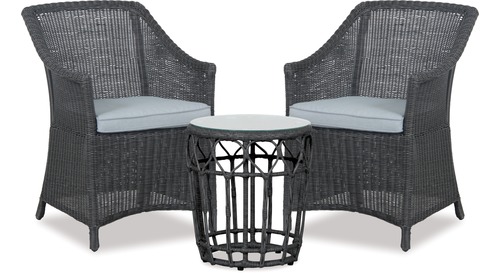 Add comfort and style to your outdoor living area with the Lucy 3-pce suite. The Lucy chair and round side table are both stylish and durable in gun metal aluminium with PE rattan back. The Lucy 3-pce suite is the perfect option for a small balcony or outdoor patio area.