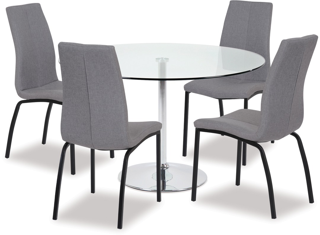 The Becky dining table is modern and stylish and offers great design at real value. Featuring a clear glass top and chrome base, this table comfortably seats 4 people and is perfect for an apartment or small home living. The Asama dining chair is designed to captivate those who love clean and simple lines. Featuring curved back legs and fully upholstered seat and back.
