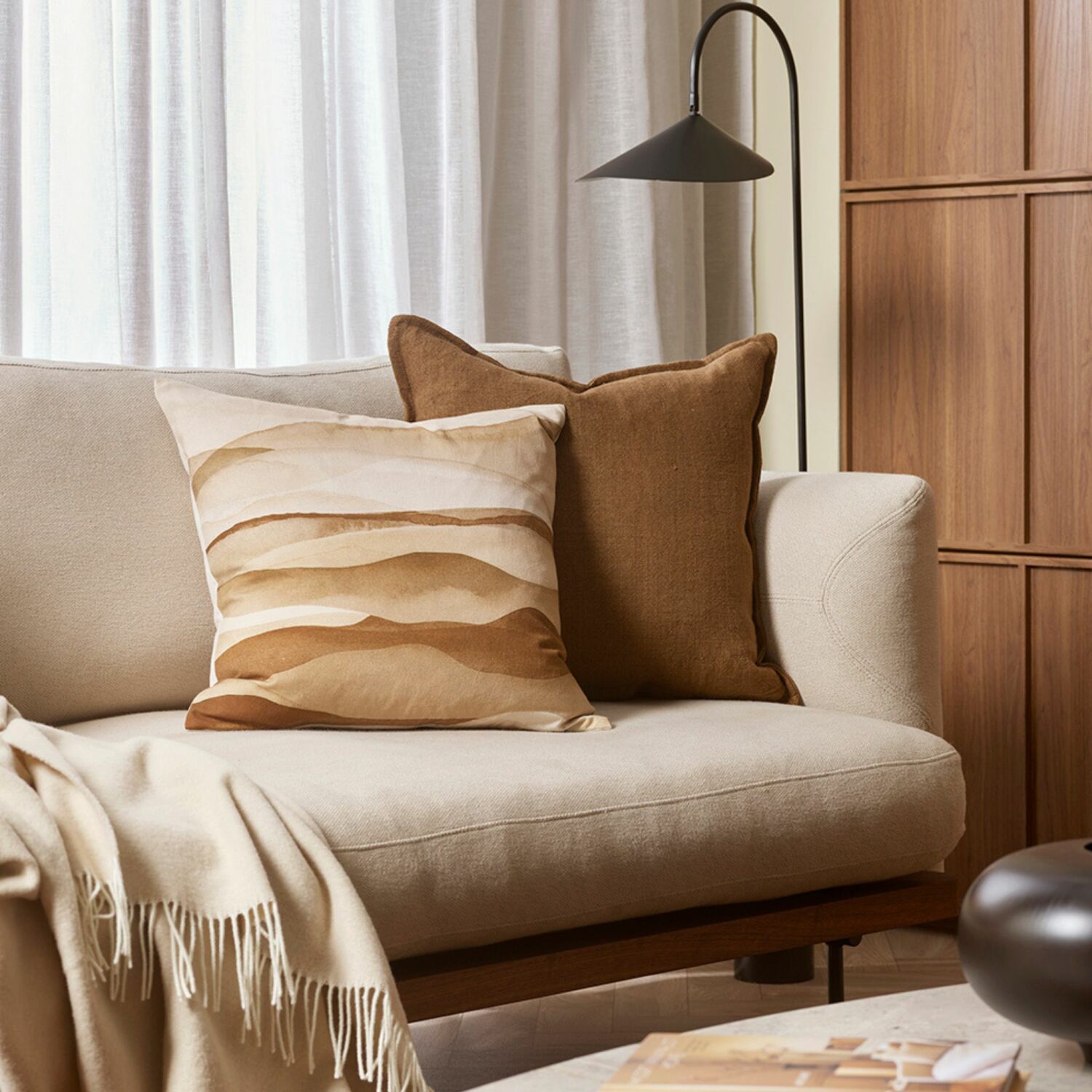 An ode to the desert, the Namib cushion references undulating dunes in sand and warm brown pigments. Printed onto a fine cotton base, the interplay of colour and form adds a refined, earthy narrative to living spaces.