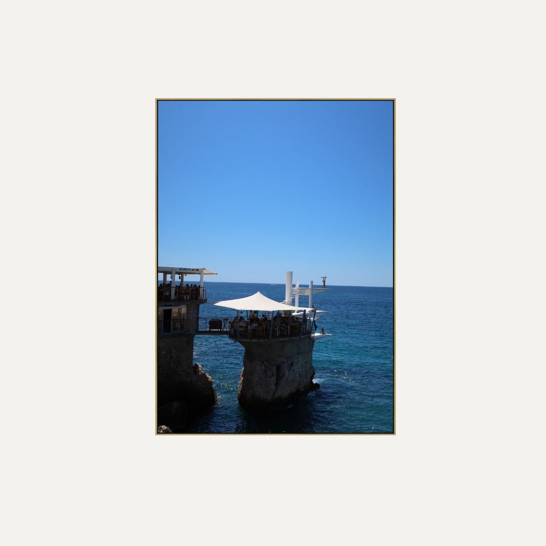 La France is a Mediterranean-inspired coastal wall art print capturing an iconic seaside restaurant perched above deep blue water. The striking architectural form, balanced against an expansive ocean horizon, evokes European summer dining, travel, and effortless coastal elegance. The open sky and surrounding sea create a sense of space, calm, and refined escapism.