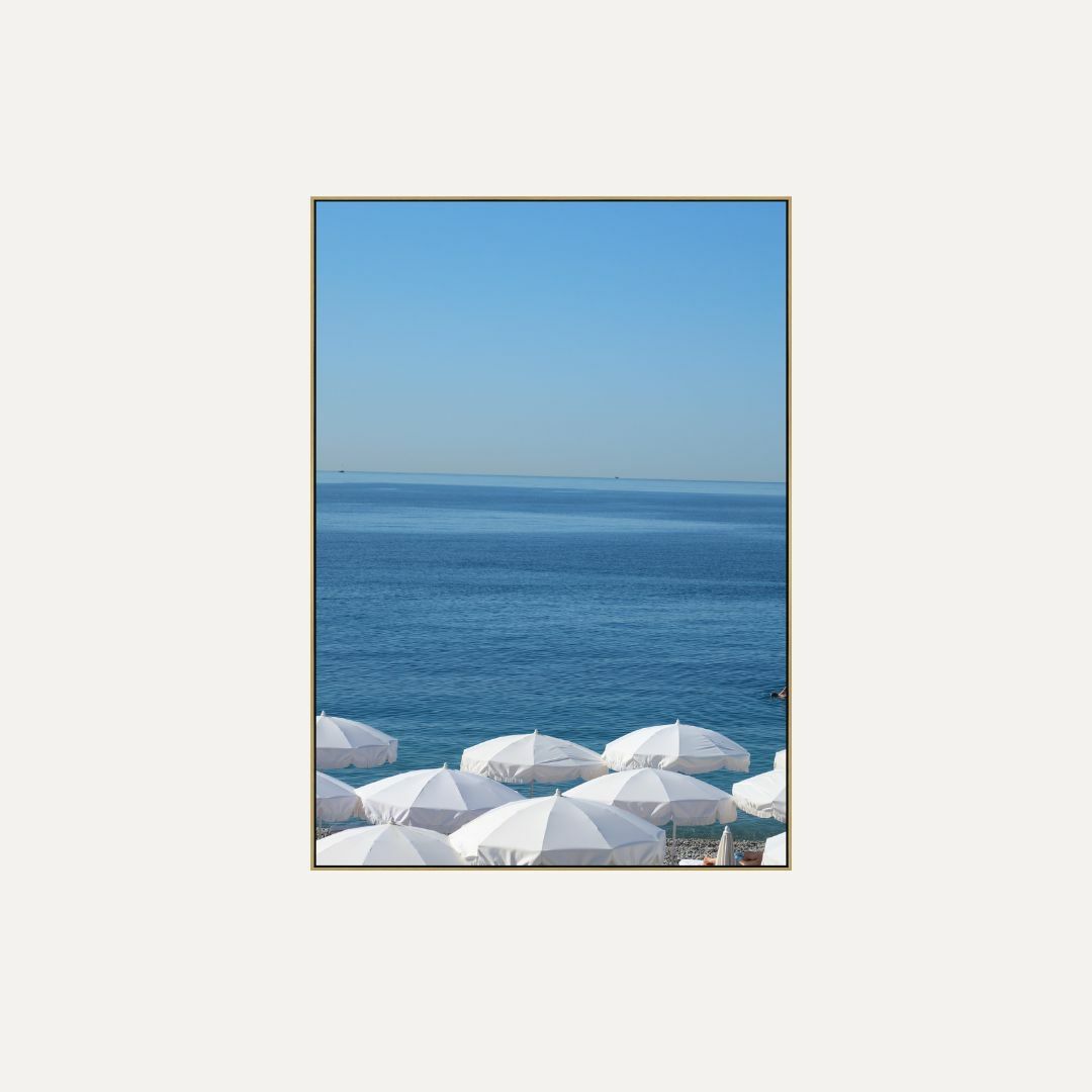 Nice Umbrellas is a Mediterranean-inspired coastal wall art print capturing the quiet elegance of the French Riviera. Crisp white beach umbrellas line the shoreline, set against layered blue tones of sea and sky, creating a calm and timeless composition. The minimal palette and open horizon evoke relaxation, light, and refined European coastal living.