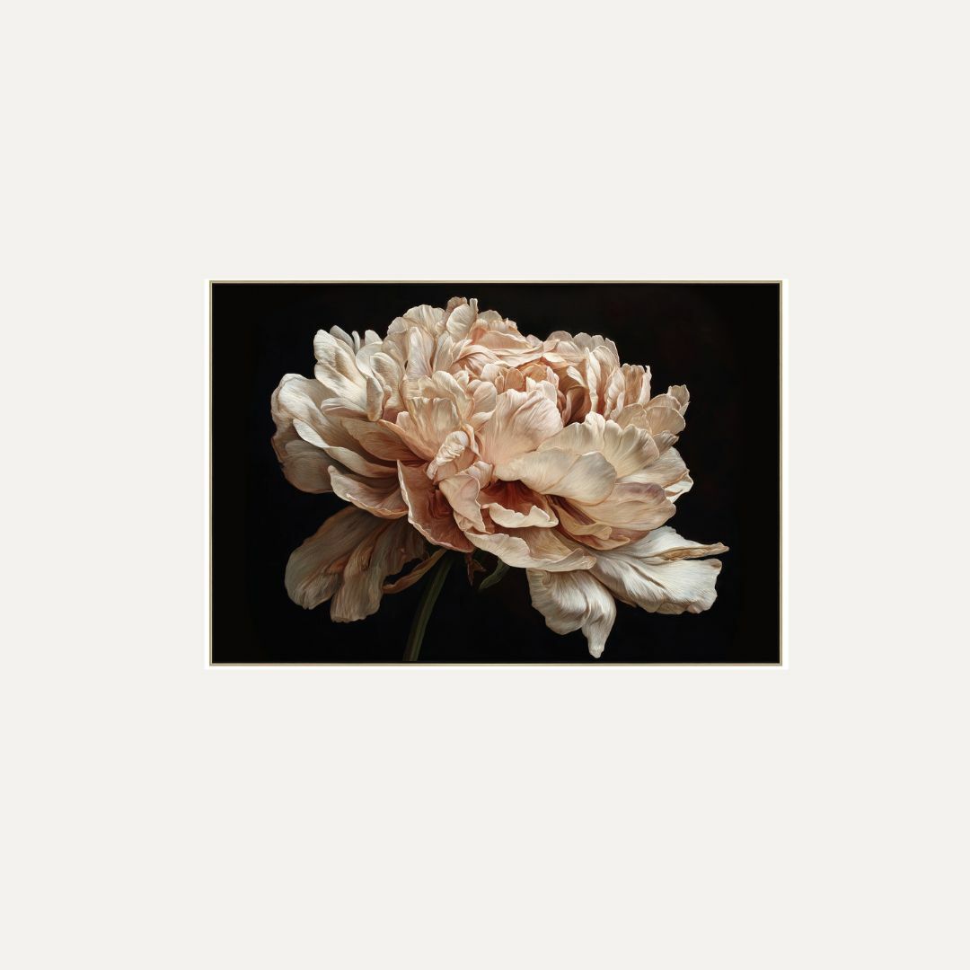 Flowerbomb is a contemporary floral artwork capturing the dramatic beauty of a full bloom in exquisite detail. Soft, layered petals in warm blush, cream, and muted peach tones unfold against a dark background, creating a striking contrast that highlights depth, texture, and movement. The composition feels both powerful and delicate, celebrating nature at its most expressive.