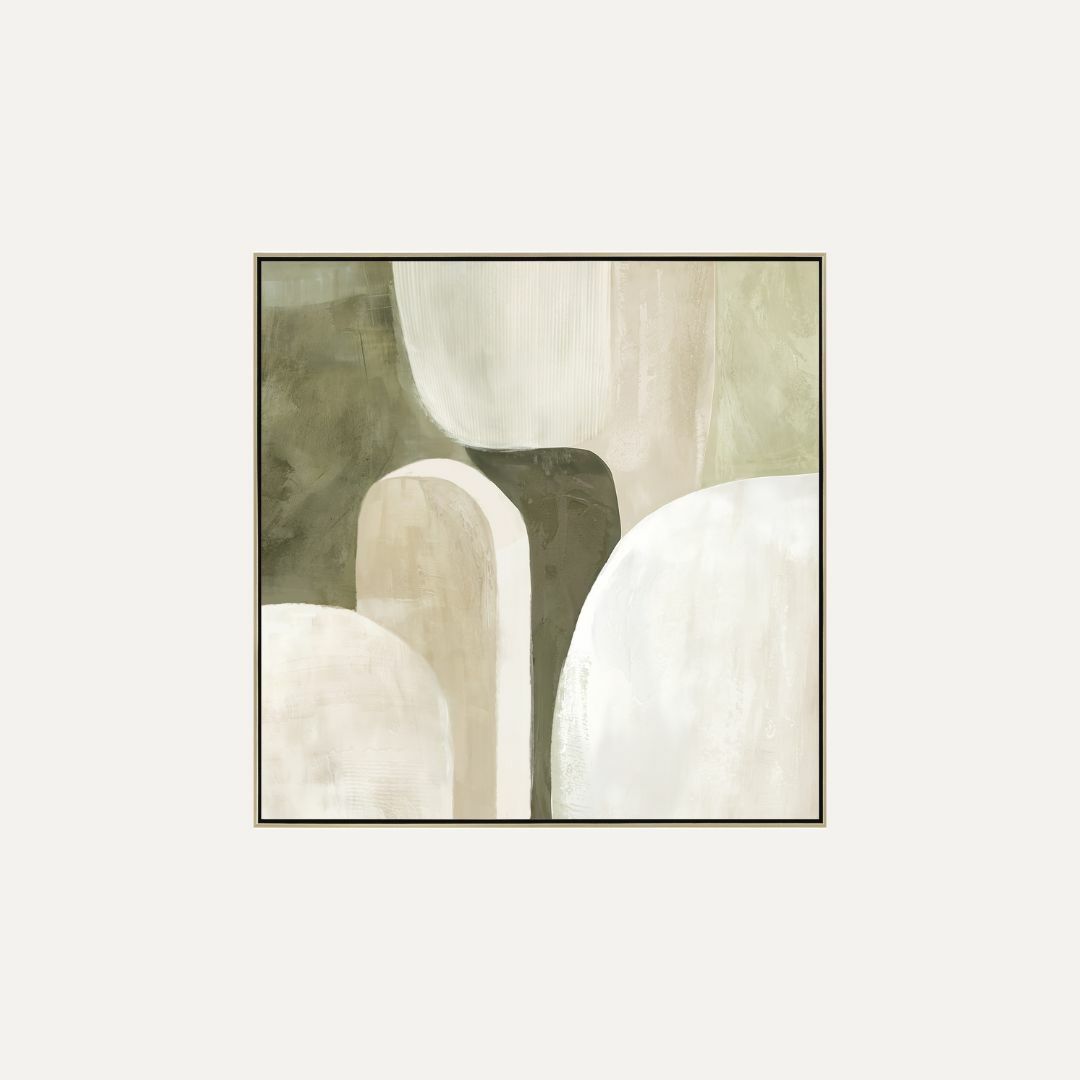 Formation Khaki is a contemporary abstract artwork defined by soft, sculptural forms and a grounded, earthy palette. Layers of warm khaki, olive, stone, and off-white flow together in a balanced composition that feels organic and architectural. Subtle texture and curved shapes create depth while maintaining a calm, modern presence.
