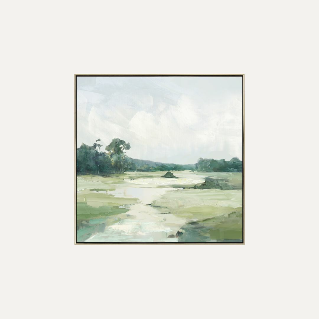 Outlander is a contemporary landscape artwork inspired by wide open spaces and quiet, natural beauty. Soft layers of green, sage, and muted earth tones stretch across the composition, balanced by a pale, expansive sky. Expressive brushwork and gentle texture create depth and movement, evoking a sense of calm, distance, and escape.