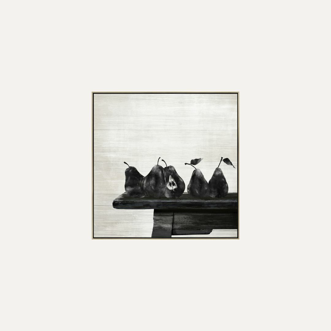 Pear Kitchen is a contemporary still life artwork celebrating simplicity, balance, and everyday beauty. A row of dark, sculptural pears rests against a soft neutral background, creating a striking contrast that feels calm, grounded, and timeless. The restrained palette and expressive brushwork give the piece a modern, minimalist presence.