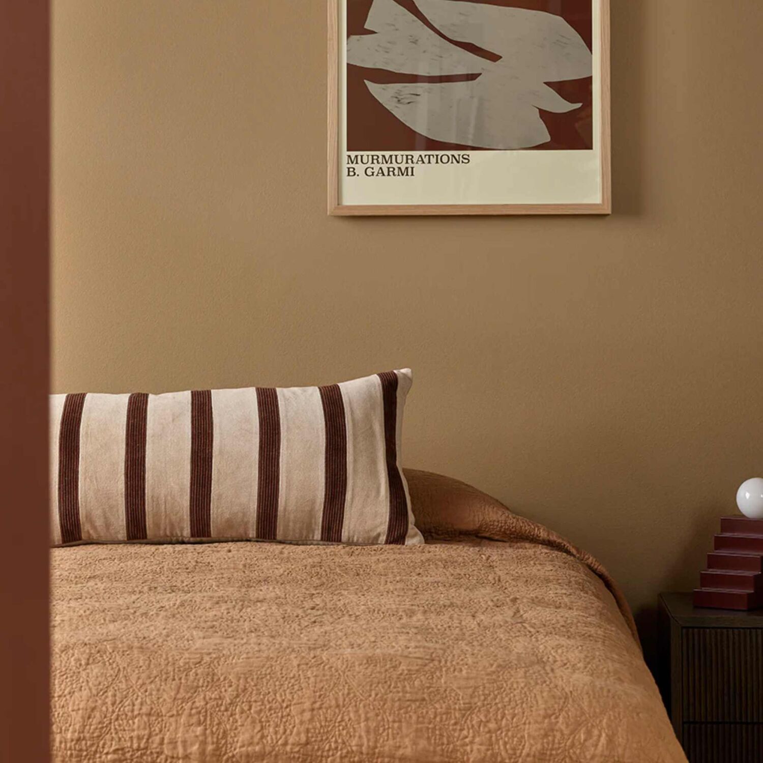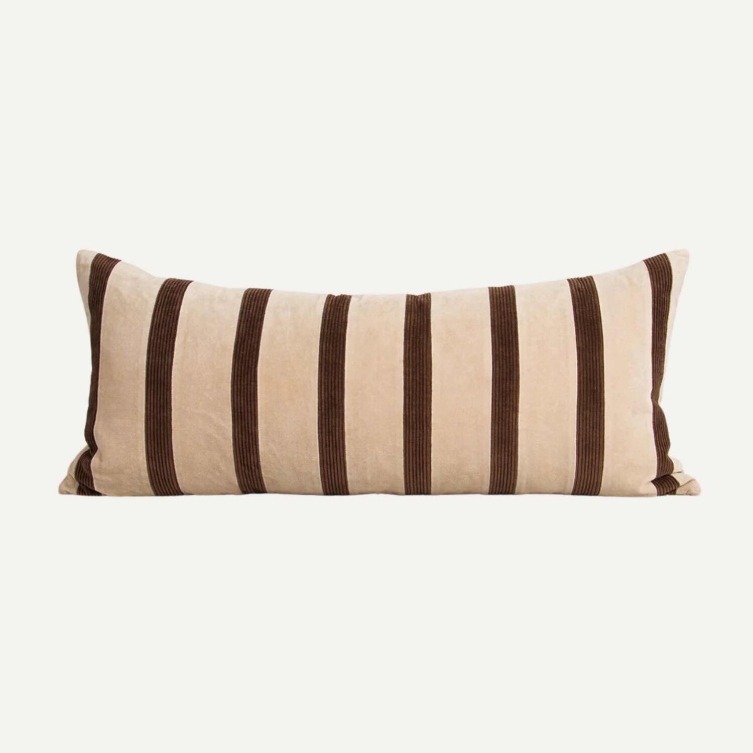 Bringing together soft cotton velvet and tactile corduroy, the Huxley lodge features a striped patchwork in chocolate tones on a warm nougat base. A sensory-rich composition, the interplay of textures, striking design, and elongated shape creates a cozy statement layer for both living and bedroom spaces. Styling Notes: Build a warm, tonal palette with Stria-Chocolate, Dover-Natural, Cyprian-Cocoa, and Cassia-Chestnut cushions. Finish with a Mosman-Oyster or Richmond-Cumin throw for a soothing, tonal composition.